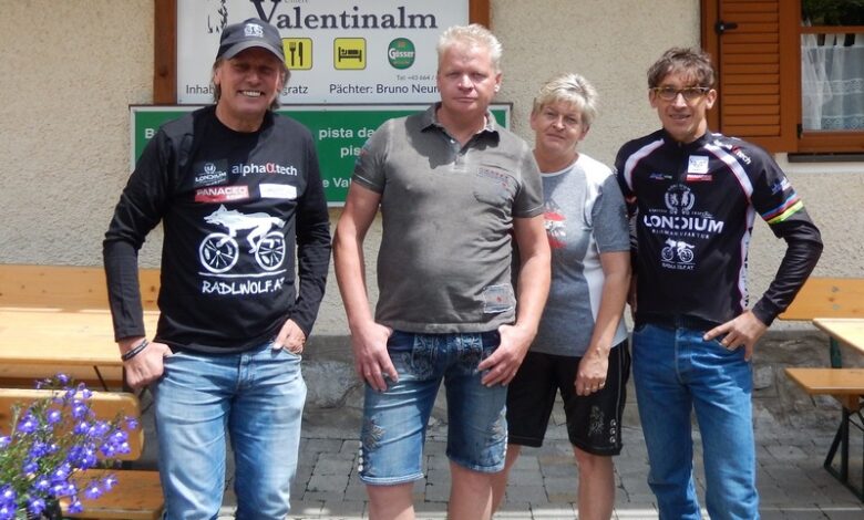 Der Radlwolf, die Wirtsleute Bruno mit Anita und Michi Kurz freuen sich auf zahlreiche Teilnahme beim „7. Radeln, Laufen und Wandern für den guten Zweck“