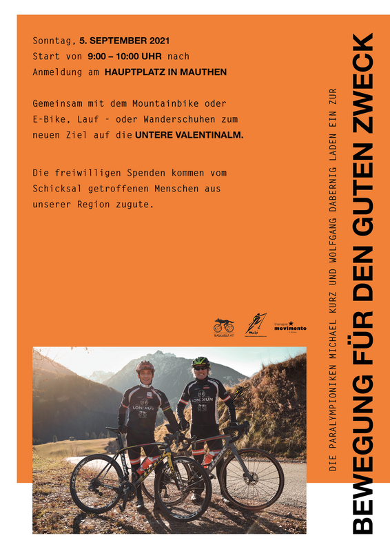 Am Sonntag, den 5. September 2021 findet das Rad.- Lauf.- und Wanderevent mit den beiden Behindertenradsportlern und Paralympioniken Wolfgang Dabernig und Michael Kurz statt. Wolfgang Dabernig, besser bekannt unter den Namen Radlwolf und Michi Kurz möchten aus Dankbarkeit ihr Schicksal nach ihrem schweren Unfall so gut gemeistert zu haben mit dieser Veranstaltung anderen Menschen mit Behinderung etwas zurückgeben.