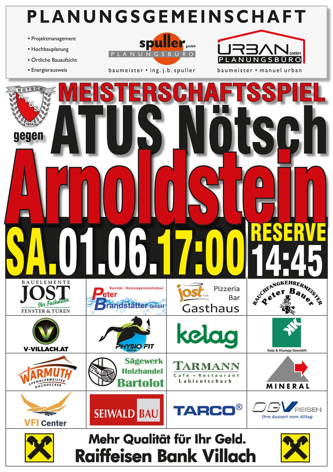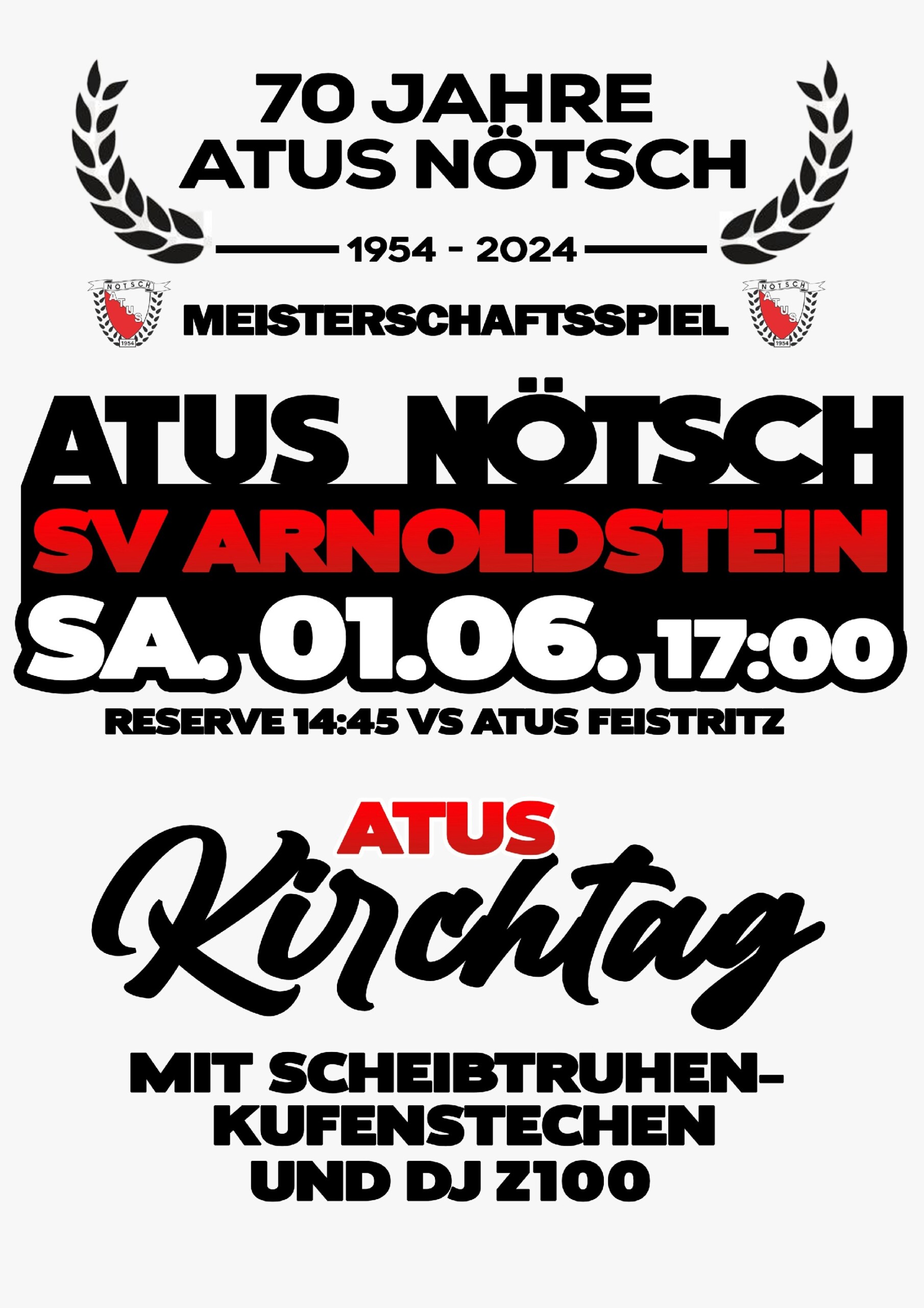 Am Samstag, 01. Juni 2024, um 17:00 Uhr treffen die ewigen Rivalen ATUS Nötsch und SV Arnoldstein aufeinander und im Anschluss feiert ATUS Nötsch sein 70. Jubiläum mit einem großen Kirchtag mit Scheibtruhen-Kufenstechen und DJ Z100!