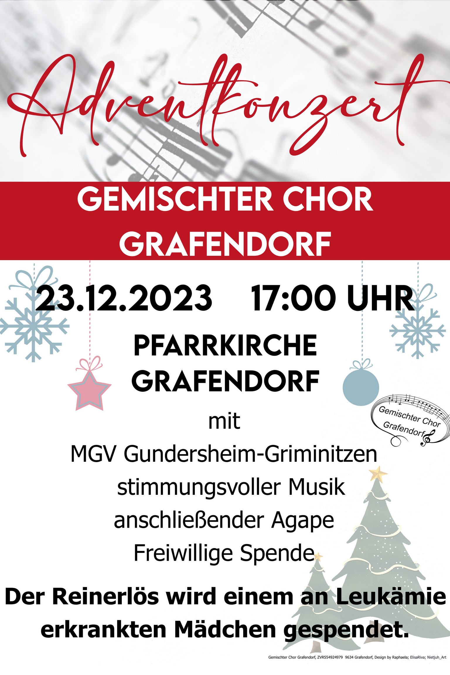 Im Sinne des „Fests der Nächstenliebe“ wird der Reinerlös des Adventkonzertes regional gespendet. Wir freuen uns auf zahlreiche Besucher:innen und wünschen allen ein fröhliches Weihnachtsfest und einen guten Rutsch ins Jahr 2024.