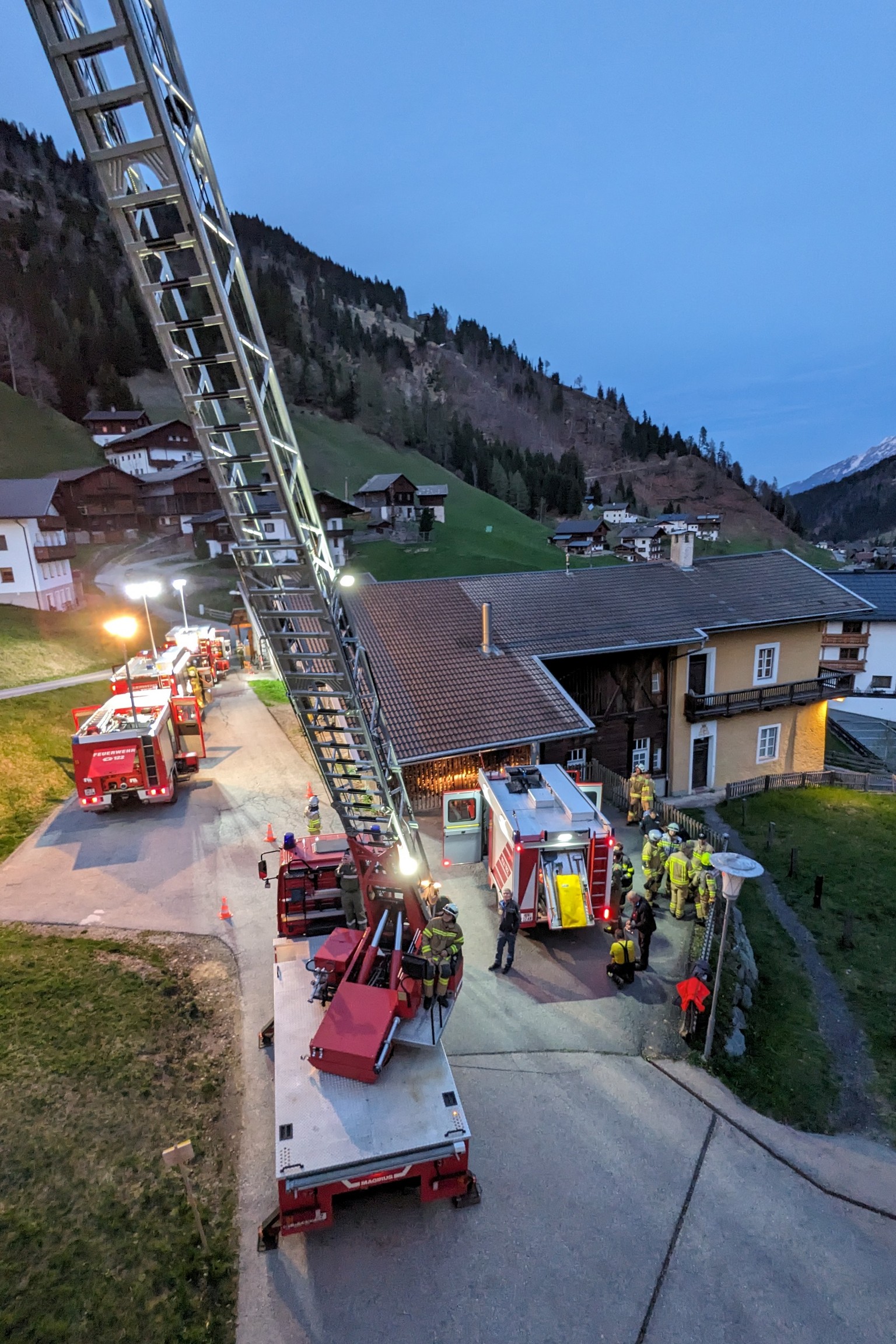 Insgesamt übten acht Atemschutztrupps in dem historischen Gebäude. Unterstützt wurde der Übungseinsatz von der Drehleiter der FF Sillian und von der mobilen Atemluftflaschen-Füllstation der FF Kötschach-Mauthen.