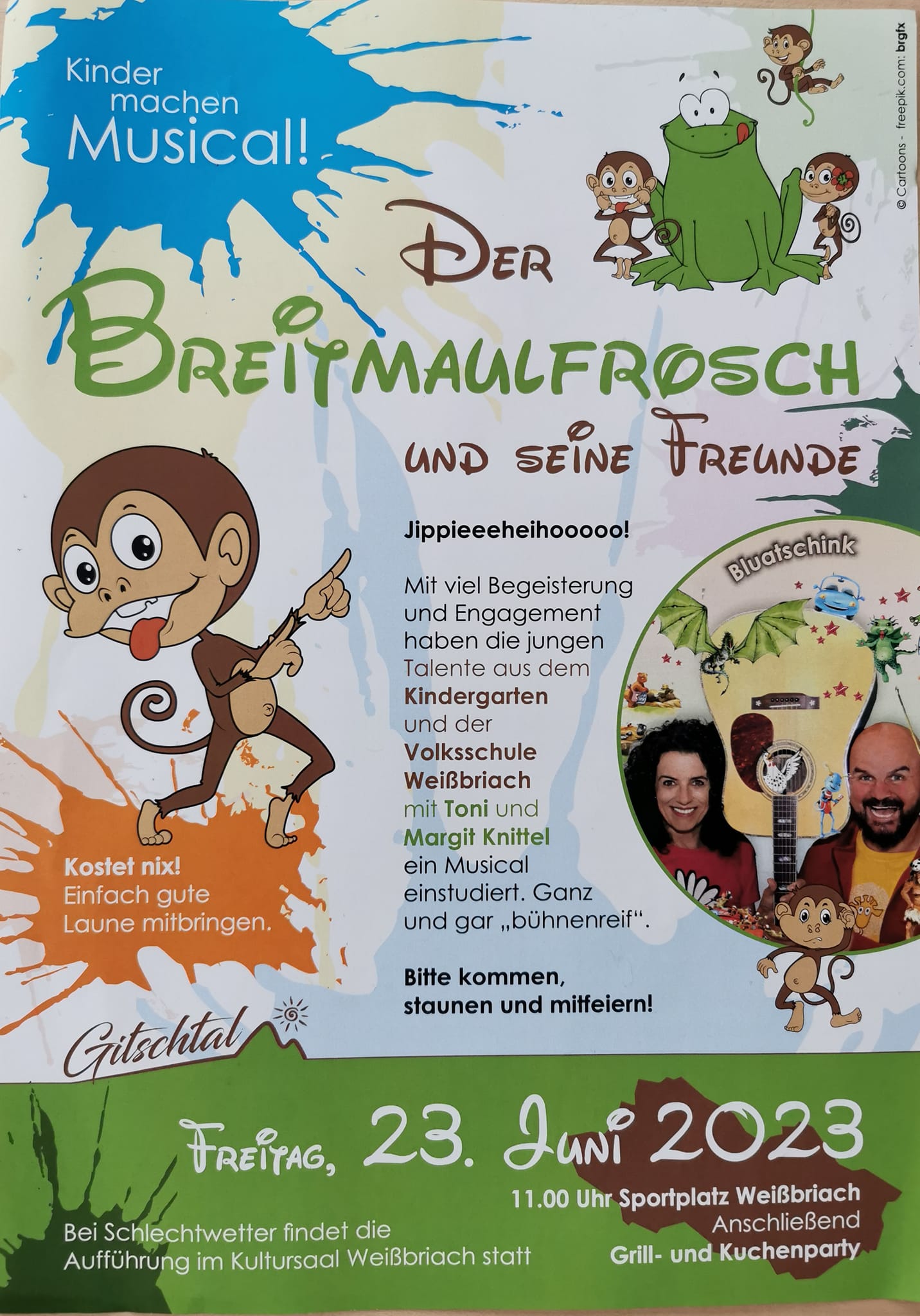 Am Freitag, den 23. Juni 2023 findet in Weißbriach im Gitschtal am Sportplatz um 11.00 Uhr ein Kindermusical statt. Mit viel Begeisterung und Engagement haben die jungen Talente aus dem Kindergarten und der Volksschule Weißbriach mit Toni und Margit Knittel von Bluatschink ein Musical einstudiert. Ihr seid alle herzlichst zu diesem Event eingeladen.