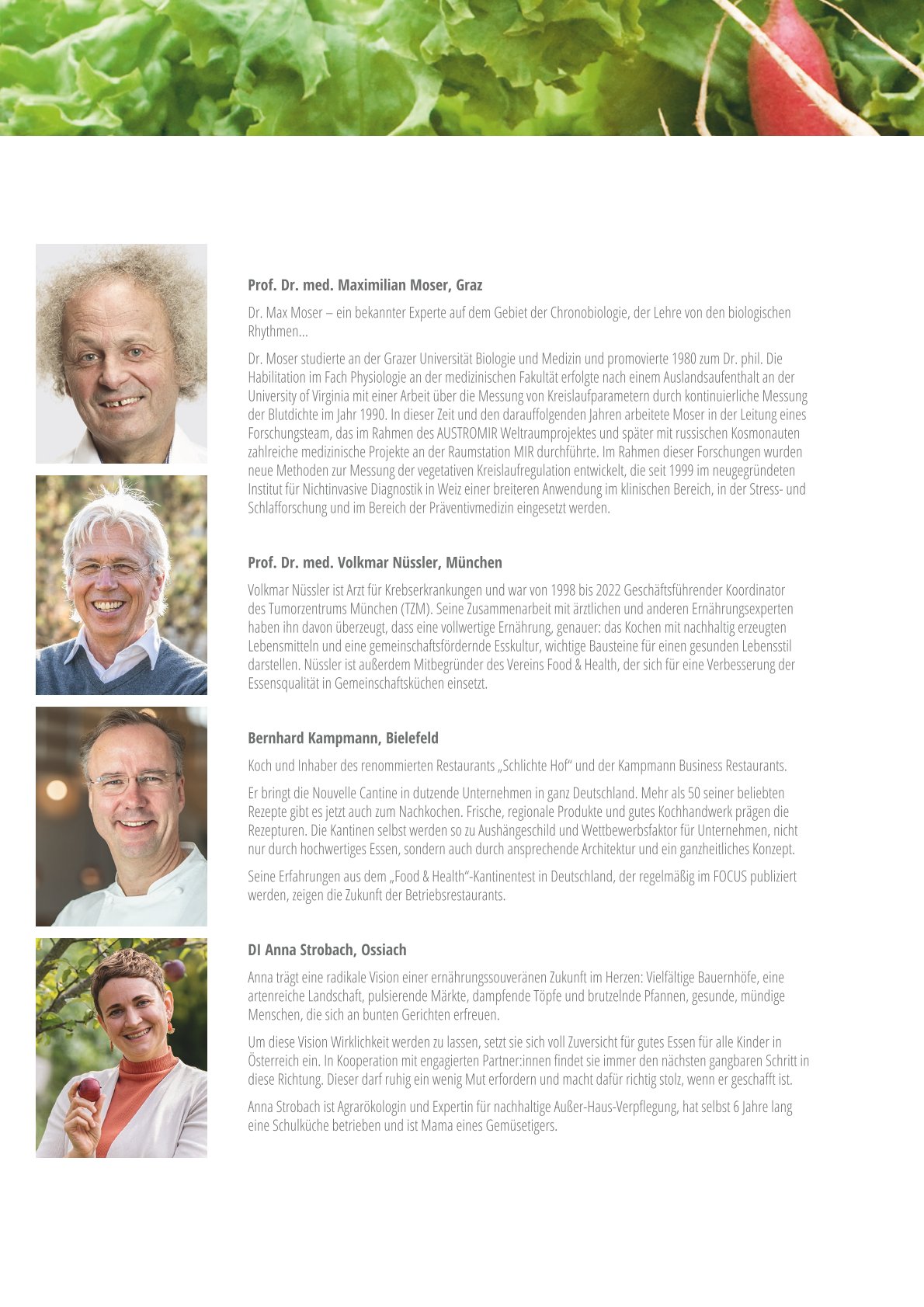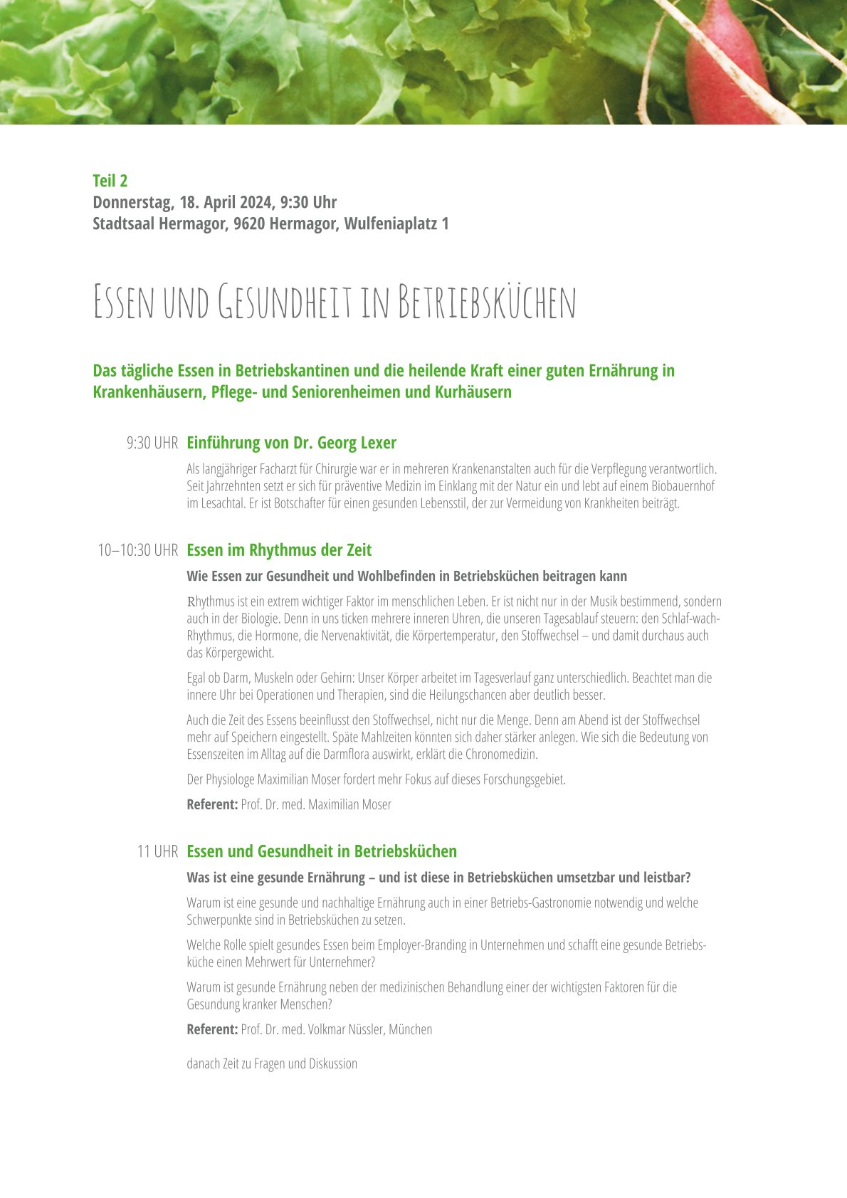 Am 18. April widmen sich die Expert:innen dem gesunden Essen in Betriebskantinen und der heilenden Kraft einer guten Ernährung in Krankenhäusern, Pflege- und Seniorenheimen sowie Schulen. Prof. Dr. med. Maximilian Moser, Experte auf dem Gebiet der Chronobiologie, plädiert etwa dafür, den Essenszeiten mehr Bedeutung zuzumessen. Denn unser Körper arbeitet im Tagesverlauf ganz unterschiedlich. Beachtet man diese innere Uhr bei Operationen und Therapien, sind die Heilungschancen deutlich besser. Gesundheitsmediziner Prof. Dr. med. Nüssler und Koch Bernhard Kampmann zeigen anhand erfolgreich umgesetzter Projekte, wie ein Aufbruch in eine neue betriebliche Esskultur in Betriebsrestaurants und Kantinen gelingt. DI Anna Strobach gibt Einblicke in ein Forschungsprojekt, das sich mit gesundem Schulessen befasste. Sie zeigt auf, was getan werden muss, damit dieses Kindern schmeckt, die Umwelt schont und gleichzeitig für alle leistbar bleibt.