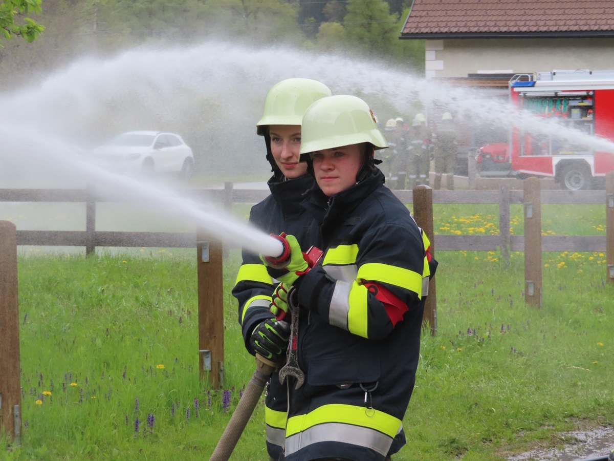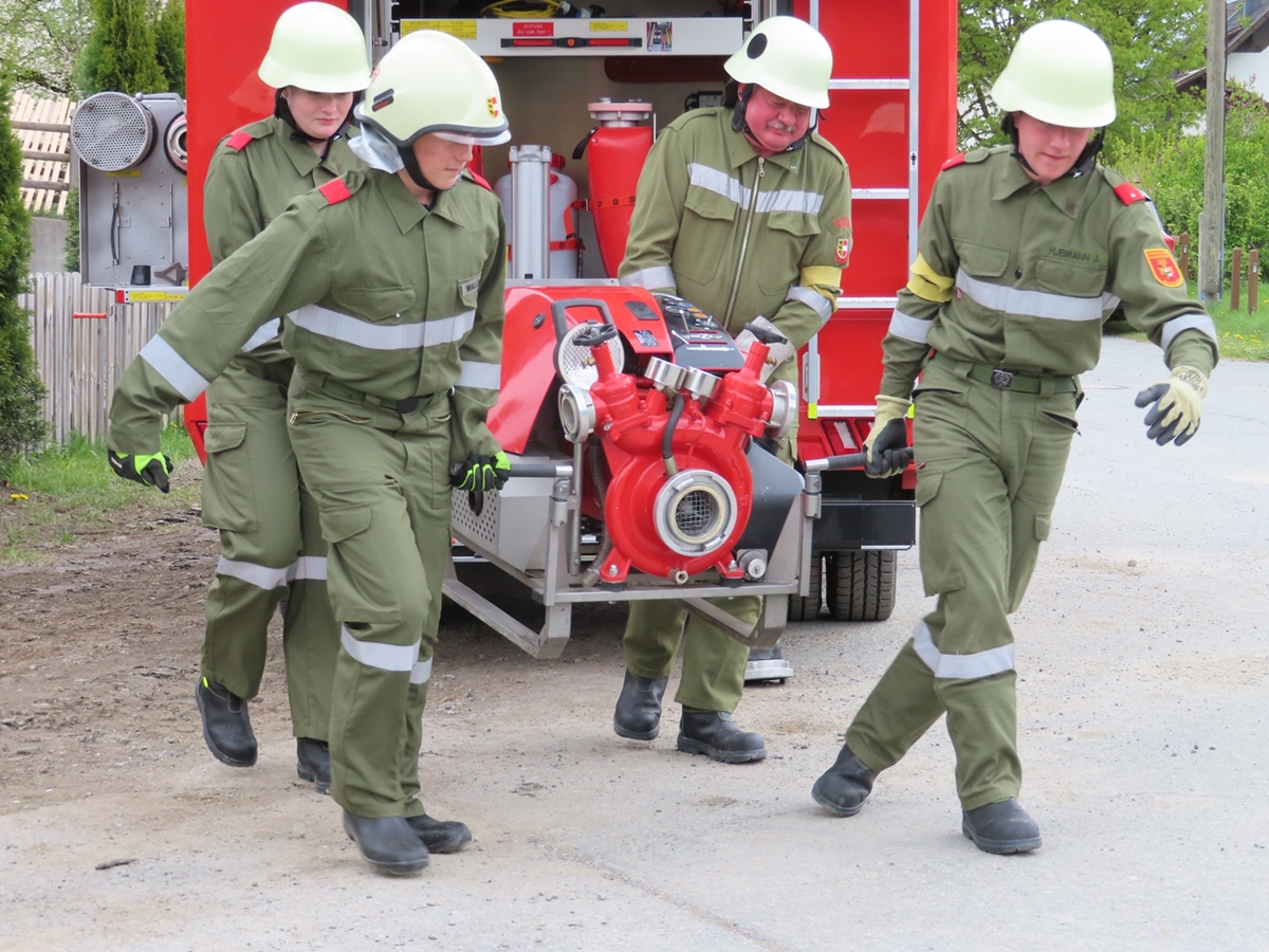 Im praktischen Teil wurde das erlernte Wissen unter den Hauptzielen des sicheren und zielorientierten Arbeitens umgesetzt. Die praktische Ausbildung umfasste unter anderem die Grundlagen der Löschgruppe, der Technischen Gruppe, der Tanklöschgruppe, das richtige Aufstellen von Leitern und Beleuchtungseinrichtungen, den Einsatz von elektrischen Tauchpumpen und die richtige Handhabung von Handfeuerlöschern. Bei der praktischen Übung mit Handfeuerlöschern konnten die jungen Feuerwehrleute echte Flammen löschen und die erlernte Theorie in die Praxis umsetzen. Ein herzlicher Dank gebührt an dieser Stelle der Firma Zerza Flüssig Gas GmbH, welche die gasbefeuerte Handfeuerlöscher-Übungsanlage kostenlos zur Verfügung stellte.