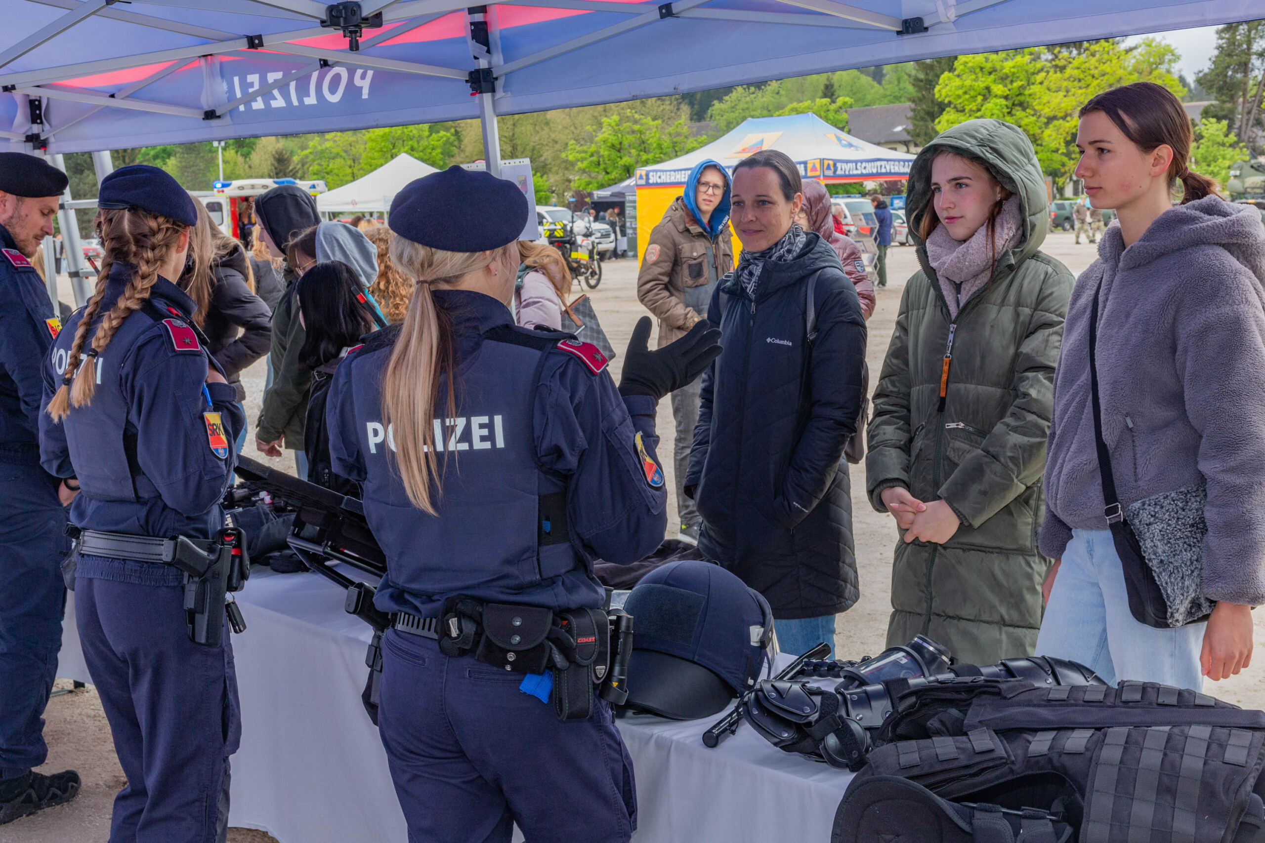 Obwohl das Wetter nicht ganz mitspielte, nutzten knapp 600 Mädchen die Gelegenheit, ver-schiedene Ausrüstungsgegenstände, Einsatzmittel und Fahrzeuge zu erkunden. Zusätzlich er-hielten sie wertvolle Informationen und Tipps zu Bewerbungsverfahren, Weiterbildungsoptio-nen und den Aufgabenbereichen einer Polizistin im Streifendienst.
