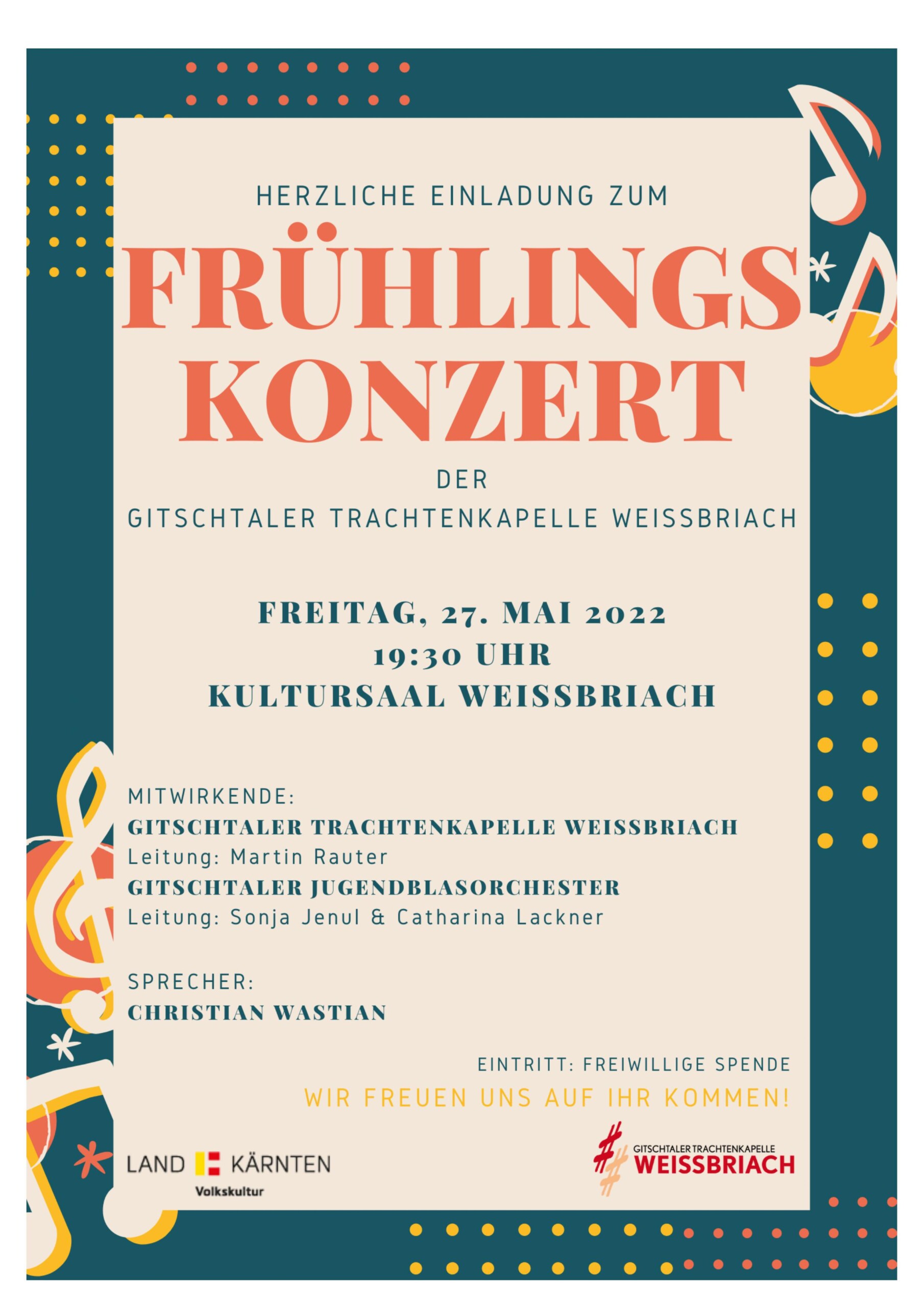 Mitwirkende sind Gitschtaler Trachtenkapelle Weissbriach, mit der Leitung: Martin Rauter und Gitschtaler Jugendblasorchester, mit der Leitung: Sonja Jenul & Catharina Lackner. Sprecher: Christian Wastian