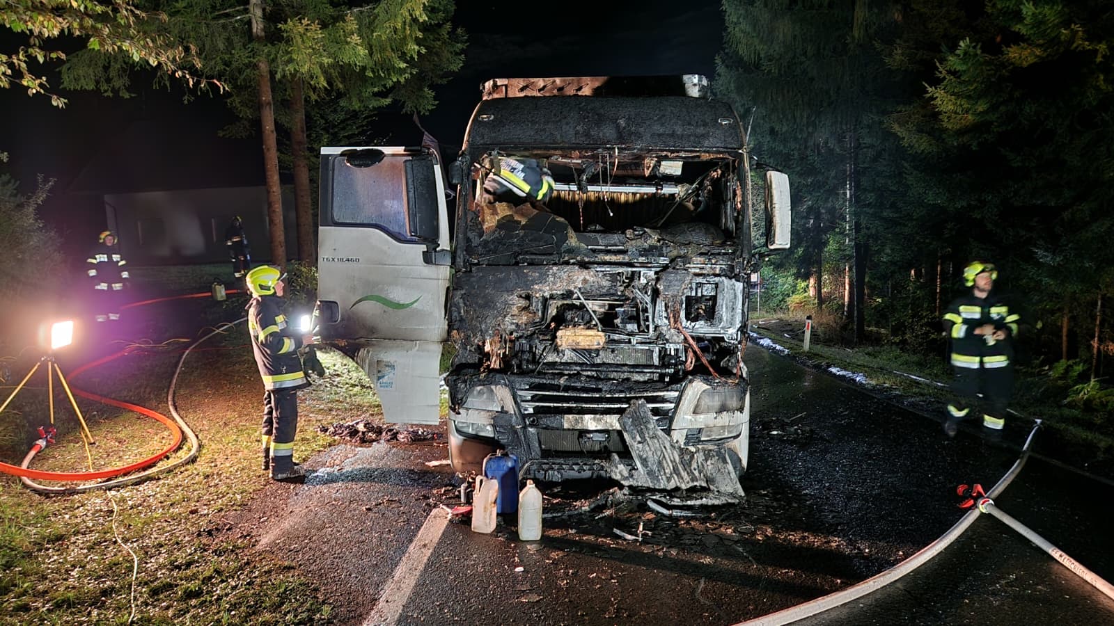 Beim Eintreffen der ersten Einsatzkräfte stand das Zugfahrzeug und ein Teil des Sattelaufliegers bereits in Vollbrand. Durch das rasche Eingreifen mehrerer Trupps unter schwerem Atemschutz konnte die Brandausbreitung auf den restlichen Sattelauflieger und den angrenzenden Wald verhindert werden.