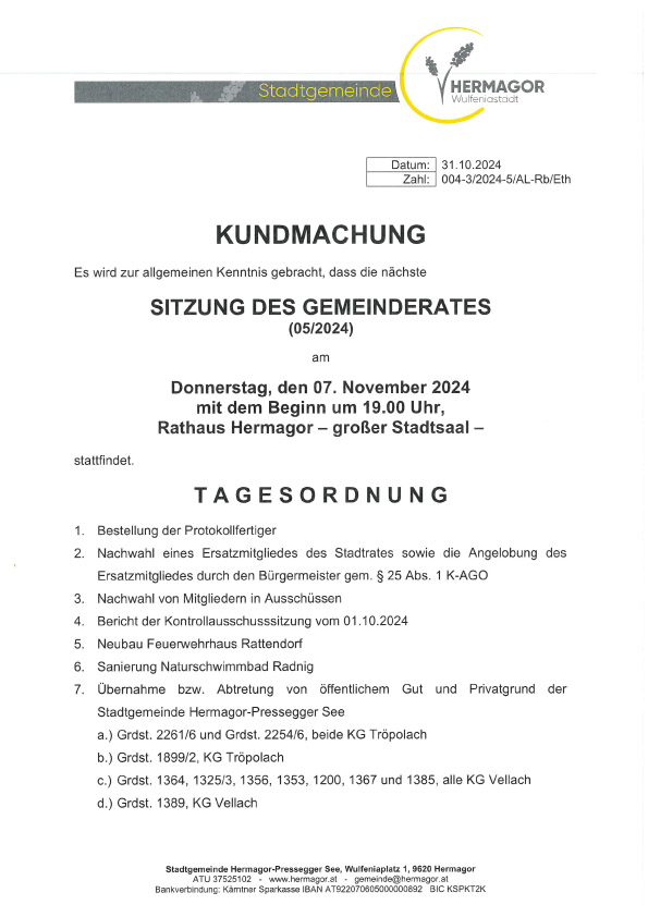 Wann: Donnerstag, 07. November 2024 ab 19:00 Uhr Wo: Rathaus Hermagor, großer Stadtsaal Kundmachung, Sitzung Gemeinderat Kundmachung, Sitzung Gemeinderat KM GR 07.11.24Herunterladen