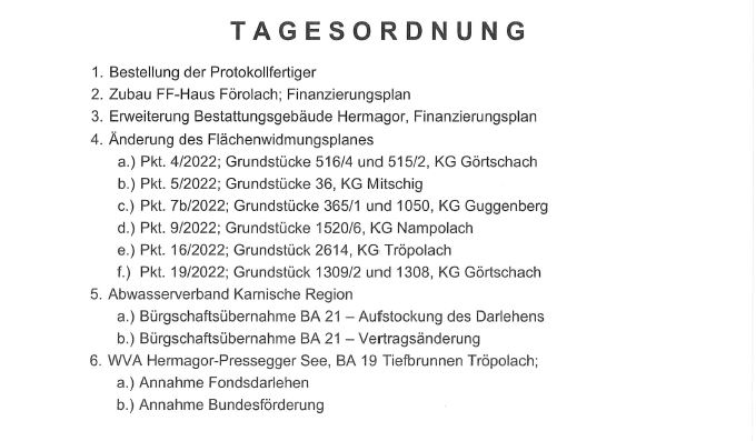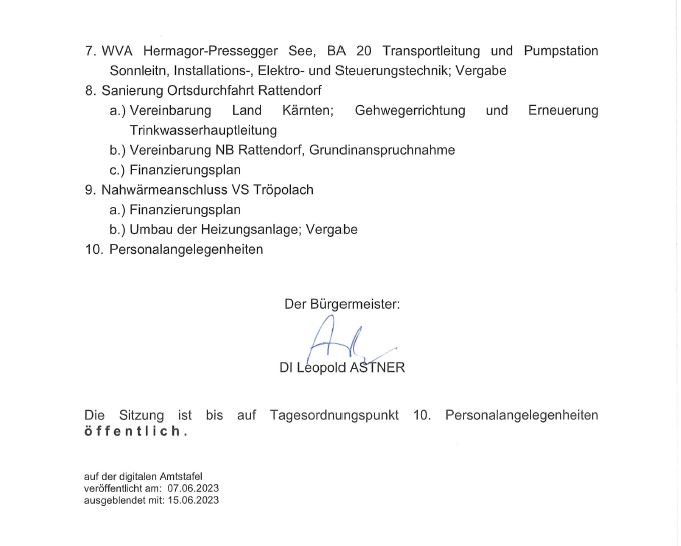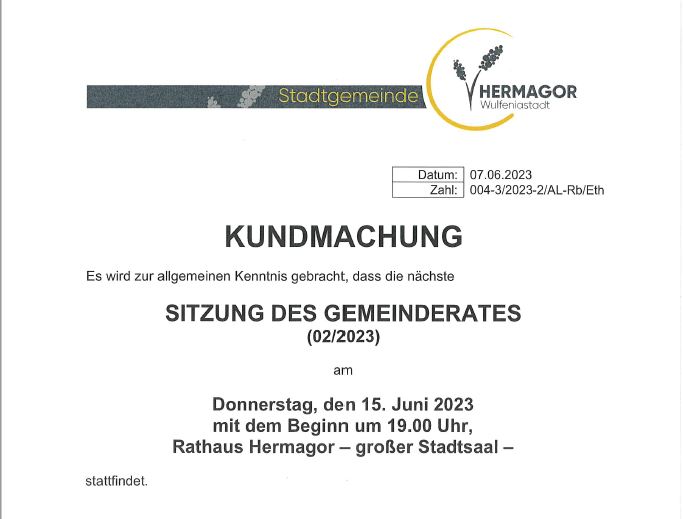 Die Sitzung des Gemeinderates findet am Donnerstag, dem 15. Juni 2023, mit Beginn um 19:00 Uhr im Rathaus Hermagor – großer Stadtsaal statt.