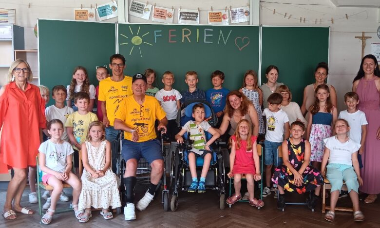 Die beiden Parasportler Wolfgang Dabernig (Radlwolf) und Michael Kurz waren zur Spendenübergabe in der Volksschule Hermagor. Es wurde eine Spende in Höhe von 2,000.-€ zu Gunsten Bendegúz übergeben, der die Krankheit SMA1 (Spinale Muskelatrophie) Typ 1, hat.