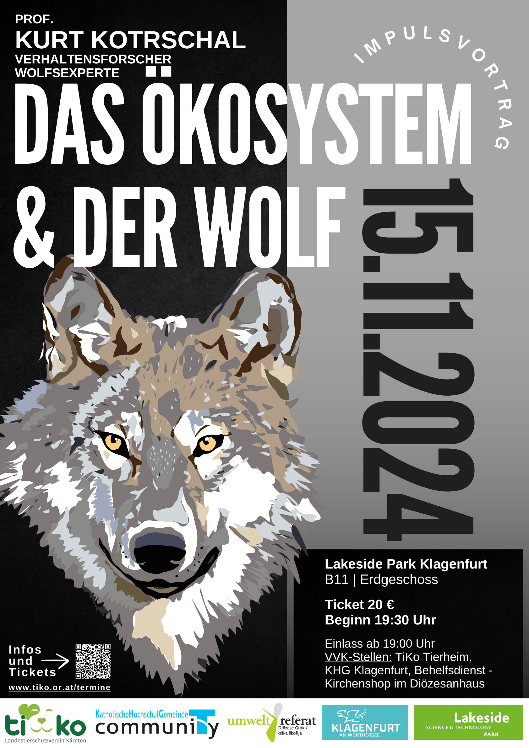 Am Freitag, 15. November 2024 veranstalten das TiKo Tierheim Klagenfurt, die Katholische HochschulGemeinde Klagenfurt und das Referat für Schöpfungs-verantwortung der Diözese Gurk gemeinsam einen spannenden und informativen Vortrag unter dem Titel „Das Ökosystem & der Wolf“. Der Vortrag wird von Prof. Dr. Kurt Kotrschal, emeritierter Professor der Universität Wien und einer der renommiertesten Verhaltensforscher Europas, gehalten.